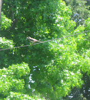 Well today things are much calmer. No insistent chirping, no mama bird sitting at the ready so I thought I'd sneak another peek: no more baby bird! Either late yesterday or early this morning, the baby bird flew away from mother's nest. Mama bird is still in the area - I found her sitting on a wire out in back of the house. I guess baby must still be somewhere around here and mama is keeping an eye out.
