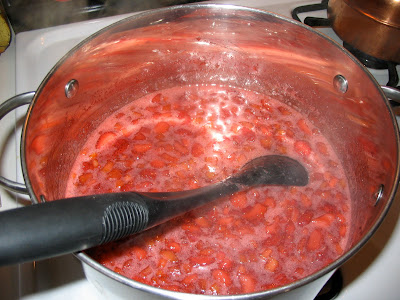 The last weekend in June, Kevin and I decided to make a batch of homemade jam. Kevin had never tried it before and I haven't made jam in about three years or so, so we were both excited about it! We bought some jars, gathered all of our ingredients together and got started.