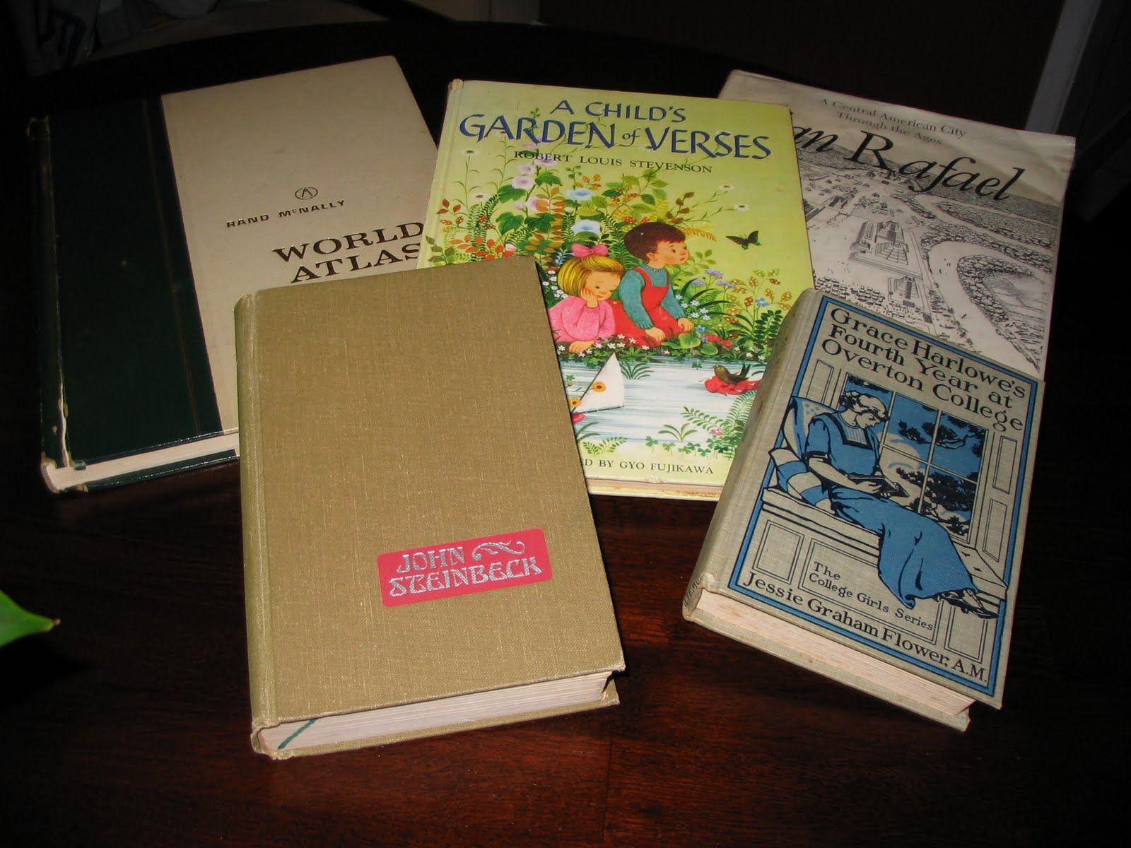 After we left the thrift store, we had a bite of lunch (Jim's - YUM!), and then headed to our library book store. Just inside the new library to the left, there is a really cool Friends of the Library book store. They've got a huge collection of books for sale, very inexpensive. They also have a FREE basket - YAY! The first thing that caught my eye was a freebie - an old clothbound book of the short stories of John Steinbeck. Pretty cool freebie! They also had a few other books that I'll be using for craft projects. Here's the day's take: