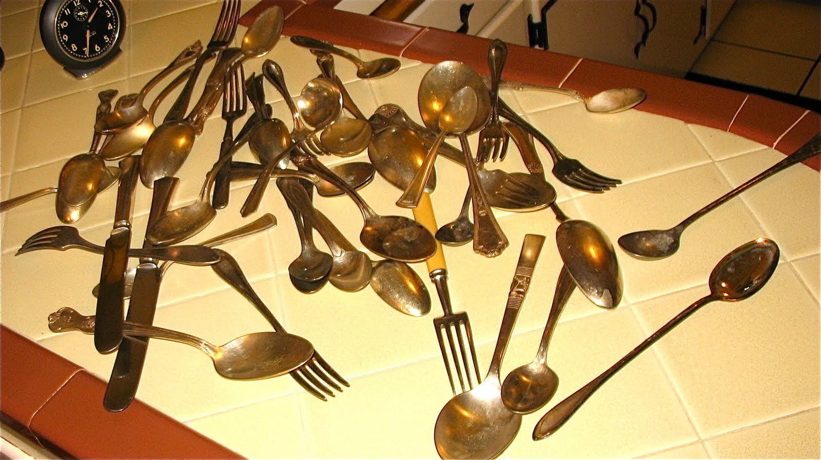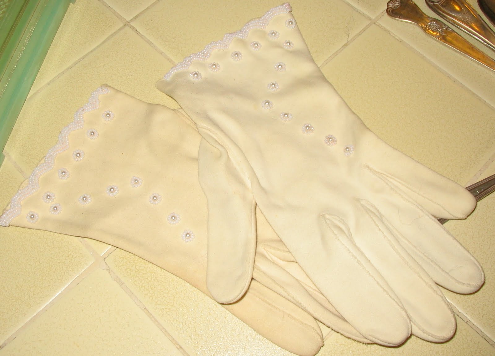 Anyway --- on to my finds. I picked up a bag of assorted flatware (remember last week's fiasco?), a darling pair of vintage women's gloves with sweet little bead and pearl details, an aqua celluloid vanity box and a charming little vintage Baby Ben windup alarm clock. As I was at the sale on the second day and they were getting ready to wind down, I asked the man if he was able to give me a better price. He added everything up - for a total of $28.00 - and said 'How about $20.00 for everything?' DEAL! 'Wow!', I thought to myself 'This is exactly what I tried to accomplish at last week's sale, but no dice.' Funny - it's definitely one of those times where fate stepped right in and did it's thing.