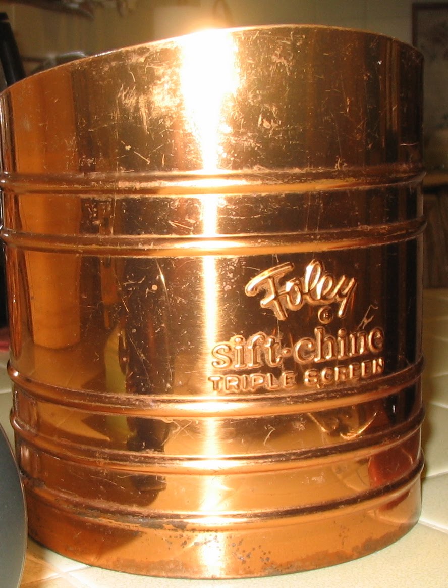 Another fun find from yesterday ... Last week I read a new-to-me book and re-read an old favorite. They're both focused on war time cooking - methods, rationing, etc. The author happened to mention that, during the 1940's, women would triple sift their flour and cake flour. In fact, they made a specific type of sifter - a three screen sifter - specifically for this purpose so that women would only have to sift their flour one time, and it would still be triple sifted. Huh. I'd never heard of such a thing. As luck would have it, I stopped in at the Goodwill store in Pasadena. I walked up and down the housewares aisles and suddenly, something jumped out at me like a beacon in the night: a three screen sifter! Now I ask you, what are the odds??