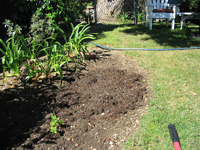 We also have a small area in the front that didn't have anything growing. It gets a lot of sun and I thought it would be the perfect place to try our hand at growing pumpkins. So, we now have 6 hills of pumpkins planted. I've put up two cute little wrought iron garden gate pieces and a wrought iron plant marker to cordon off the pumpkin patch. Hopefully this will alert our gardeners to the pumpkin patch - and will help keep the curious Miss Daisy out. Here are a few pictures of what we worked on this morning: