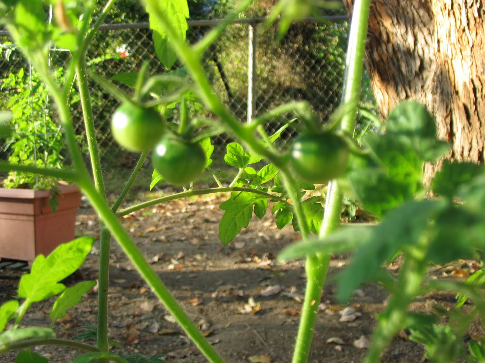 Tonight when I went to water, I was happily surprised to find all sorts of new discoveries out there. The first discovery is that we have tomatoes - and quite a few of them!! We found about 8 or 10 of them just sitting there pretty as you please. I swear, we were out there on Sunday and there were only flowers on the plants - no actual fruit. Those little lovelies just seemed to burst out over night!